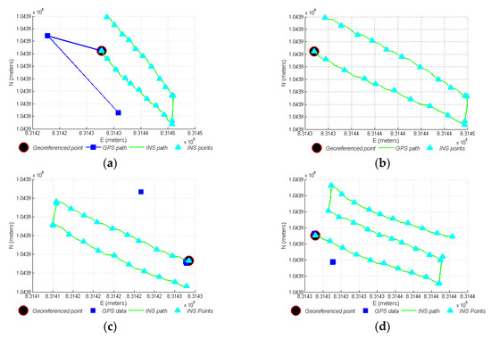 In Figure 9a, points georeferenced with the GPS, out of the real path can be seen; they are considered georeferencing errors. In this case, only four readings were obtained from the GPS, but in fact, 20 referencing points were generated with the INS. Contrarily, in Figure 9b the points georeferenced by means of the proposed INS, which generated a spatial reference modified for movement, with the 20 referenced points and with minimal position errors are shown. In this case, only the first GPS point was taken into account (in Gauss-Krüger plane coordinates NE) as the starting point, with an initial error of 3.18 m, the other georeferencing points were calculated through the displacement information from the INS, and had an error of ±0.15 m. Figure 9c,d show the paths generated by the system in movements 4 and 5, respectively. Use of the proposed INS generated adequate georeferences in terms of the position, sequence, and advance of movement, in different step sizes, velocities, forms of covering spaces, and direction of the INS.