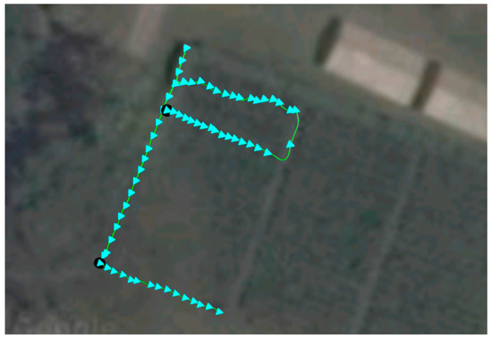 The evaluation of the INS in navigation mode was made on a parcel sown with coffee, with a 1.5 m × 1 m sowing distance. In Figure 10 the results obtained from the parcel sown with coffee, with apertures 1 and 1.5 m long, multiple of the sowing distance, and an initial GPS point of 1,043,868.786 N 831,230.1454 E (with an initial error of 1.8 m over the real value) are shown. Two movement trajectories can be observed: (i) one around the edges of the parcel; (ii) and a second U-shaped one inside the parcel. Overall, 80 georeferenced points were generated with the INS, whereas the traditional GPS only obtained four points. The evaluation for this case showed that the system neither overestimated nor underestimated displacement and that it was capable of estimating the position of the trees to be checked within the parcel one by one. The displacement velocities were within the range mentioned in Section 4.1.1, from 45 cm·s−1 and 42 cm·s−1, and the median relative error of the path generated by the INS was ±0.26 m.
