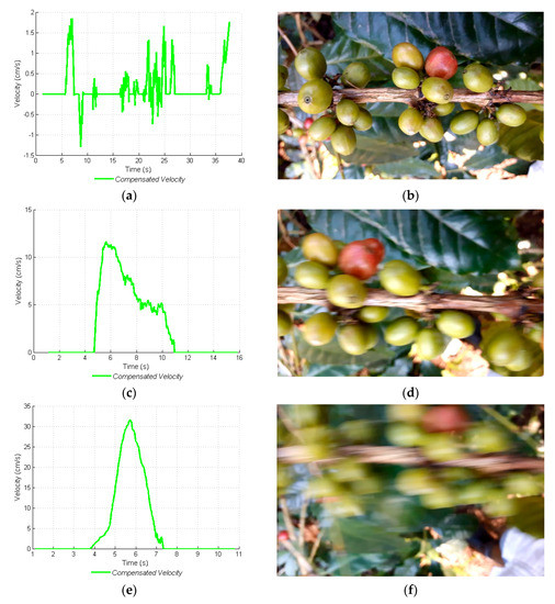 Displacement velocities of the mobile device over the coffee branch. (a) Compensated velocity signal. Low velocity; (b) Image acquired at low velocity; (c) Compensated velocity signal. Medium velocity; (d) Image acquired at medium velocity; (e) Compensated velocity signal. High velocity; (f) Image acquired at high velocity.