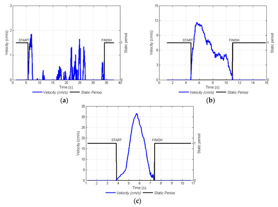 Detection of movement periods for three velocities. (a) Low velocity; (b) Medium velocity; (c) High velocity.