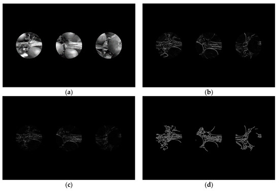 From each cropped video by movement periods, three frames or images were selected corresponding to the beginning, middle, and end of the movement. In each image, three regions of interest (ROI) with circular shapes were selected in the central zone of the image, located on the right, center, and left side of the image, as shown in Figure 13a. Each ROI had a diameter of 100 pixels, due to their location on the branch, and the location of the coffee fruits in the images. On each region of interest, three edge detectors were applied on the red channel of the original image: (i) a Sobel operator with a 3 × 3 kernel in two directions: horizontal (Sobel.x) and vertical (Sobel.y) (Figure 13b, Equation (9)); (ii) a Laplacian filter with 3 × 3 kernel (Figure 13c, Equation (10)); and (iii) a Canny detector, capable of adjusting to the lighting conditions in the image, with an inferior limit corresponding to a standard deviation of the complete image (σ) in the red channel, and a superior limit of three standard deviations (3σ) (Figure 13d, Equation (11)). Regarding the resulting intensity information in each ROI, a sharpness index for each filter was calculated: (i) for the Sobel filter, the sum of the square root of the squared Sobel.x, Sobel.y values, in each pixel in the ROI was calculated (Equation (9)); (ii) for the Laplacian filter, the sum of the absolute value was used (Equation (10)); and (iii) for the Canny filter, the sum of the pixels in the ROI was used (Equation (11)):