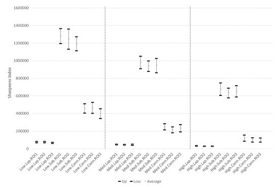 Confidence intervals for sharpness index at different velocities of image acquisition.