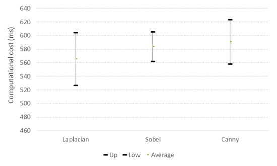 Under the two selection criteria for the blurriness rate (statistical difference for each velocity and minimum computational requirement) either of the indexes work adequately. Analyzing the results obtained with the confidence intervals in Figure 14, only three types of video frames were accepted: those that present, in one of the ROI, a sharpness factor above 1,100,000 for the Sobel filter and index, above 54,000 for the Laplacian filter and index, or above 290,000 for the Canny filter and index. If the value was below these values, the image was considered to not have the necessary sharpness to be processed, because it could have been acquired at velocities above 5 cm·s−1, which generates blurriness in the video frames.