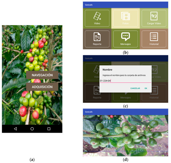 Appearance of the application. (a) Initial screenshot of the developed app; (b) Menu of the ACM mode; (c) Registration of the branch to be acquired; (d) Focus zone of the camera on the branch.