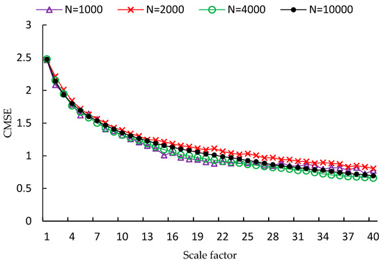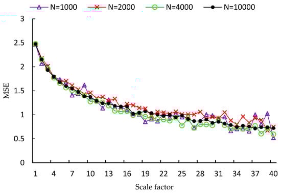 Examples of MSE, CMSE and FMSE values for 1/f noise signals are shown in Figure 5, Figure 6 and Figure 7, respectively. Different from white noise, 1/f noise signal is time-correlated, so the entropy values of 1/f noise theoretically remain the same for different time scales.