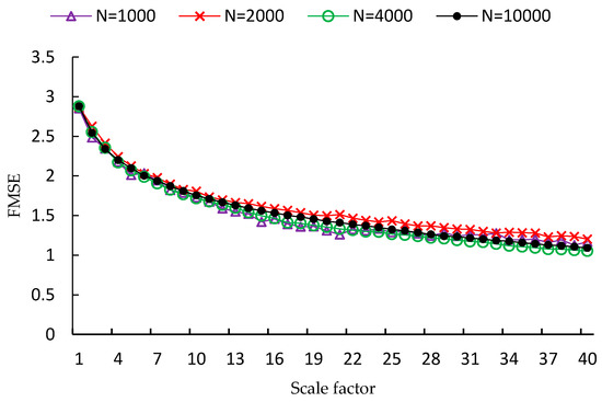 FMSE is first evaluated using two synthetic noise signals, including white noise and 1/f noise. Since the length of time series is a factor that influences the performance of MSE analysis, four different lengths of time series are used in the experiment, which are N = 1000, N = 2000, N = 4000, N = 10,000, respectively. For each type and each length of noise signal, one hundred independent time series samples are used to calculate the MSE, CMSE and FMSE values. Examples of MSE, CMSE and FMSE values for white noise signals are shown in Figure 2, Figure 3 and Figure 4, respectively.