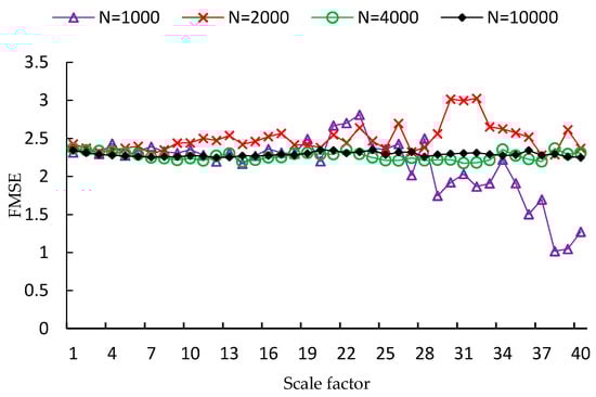 Equations (A3) and (A4) can be approximated numerically. For example, we can set the following conditions for numerical calculation: (1) ; (2) the range of the calculation is , with = 30,000. The values calculated from above analytical equations are in good agreement with those obtained by the FMSE algorithm on simulated white noise time series. It is necessary to mention that the derivation of FMSE values is similar to that of MSE, we would like to refer readers to reference [6] for more detailed information.
