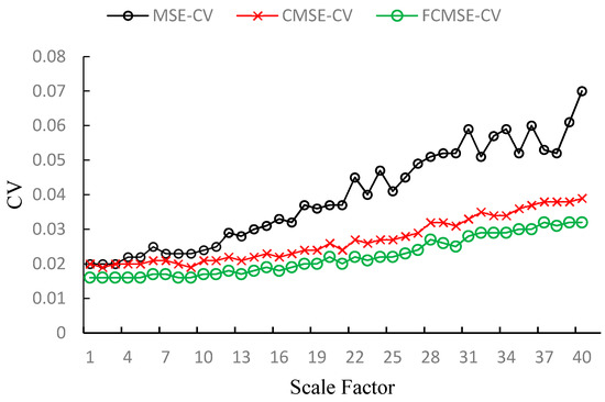 The lower the CV of estimations for samples generated by the same noise, the better the performance is. The CVs of white noise with two different data lengths (N = 1000 and 10,000) are shown in Figure 8 and Figure 9, respectively. As shown in the figures, the CVs of estimations for time series with 1000 points are much larger than those of 10,000 points. It is obvious that the CVs of FMSE values are always the lowest among the three metrics. Furthermore, as the scale factor increases, the improvement in CV of FMSE over the other two becomes larger.