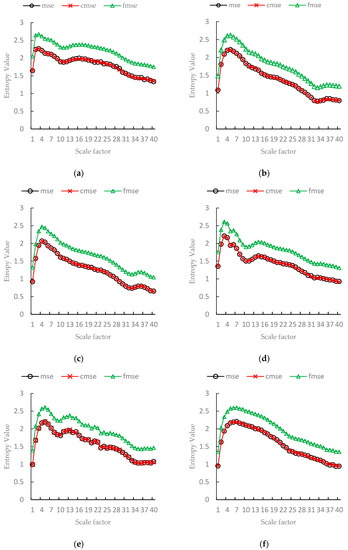 The means of MSE, CMSE, FMSE values on bearing vibration data (1730 rpm, 7 mils). (a) Normal state; (b) Outer race fault (3 o’clock position); (c) Outer race fault (6 o’clock position); (d) Outer race fault (12 o’clock position); (e) Ball fault; (f) Inner race fault.