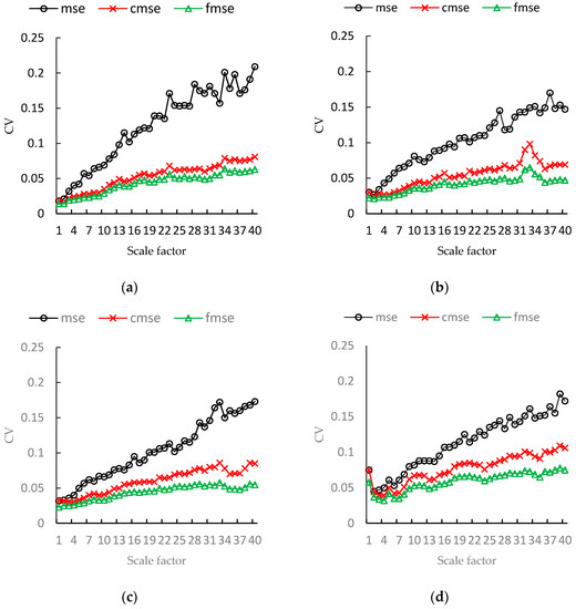 In the next, the convergence of the entropy values estimated from one hundred independent noise signals is examined. It is reasonable to assume that entropy values estimated for different samples generated by the same noise function should be convergent. In other words, the dispersion of the estimations for different samples from the same noise function is the lower the better. Since, the mean value of FMSE is different from that of MSE, CMSE, we use coefficient of variation instead of standard deviation to measure the convergence. The coefficient of variation (CV) is defined as the ratio of the standard deviation , over the mean :