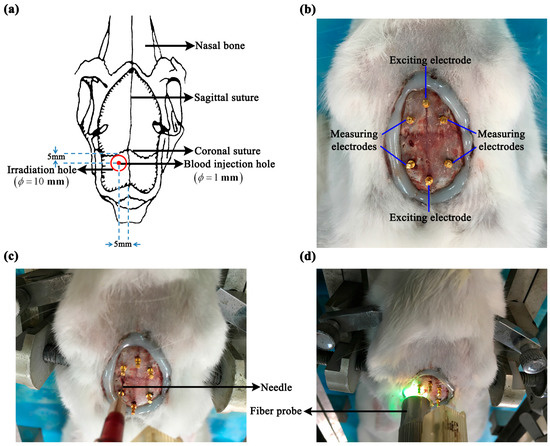 Localized intracerebral hemorrhage and ischemic models. (a) Schematic diagram. (b) Electrode distribution for in vivo measurement of whole-brain impedance spectra. (c,d) Intracerebral hemorrhage model (autologous blood injection method) and ischemic model (photochemical induction method).