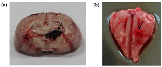 (a) Intracerebral hemorrhage model; (b) Ischemic model. The arrow indicates the location of the stroke lesion.