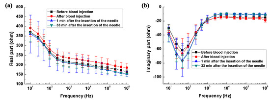 Across the 10 Hz–1 MHz range, brain impedance was higher after blood was injected (hemorrhagic brain) than that before (healthy brain) (Figure 5a). The results are in agreement with those of Dai et al. [23], who established a hemorrhagic model by injecting autologous blood into the subarachnoid space, and found that brain impedance increased after blood was injected (60 min after completion of blood injection, at 50 kHz). However, Manwaring et al. [24] and Dowrick et al. [20] established brain hemorrhage models in piglets by injecting autologous blood, and found that brain impedance decreased at 50 kHz after blood was injected. The reason for the difference is not clear.