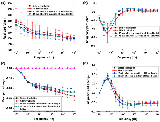 Figure 5c,d shows the differences in real and imaginary parts of brain impedance spectra in the ischemia group (measured before and after irradiation with green cold light) and its control group (measured 15 min and 45 min after the injection of rose bengal dye). In Figure 5c, the difference in the real part before and after irradiation with green cold light changed slowly from 10 Hz to 500 Hz and then decreased significantly from 500 Hz to 1 MHz, with difference greater than four ohms across the whole frequency range. The difference in the real part in the hemorrhage group was significantly larger than those in its control group (p < 0.01). The difference in the imaginary part increased quickly from 10 Hz to 100 Hz, then decreased quickly between 100 Hz and 1 MHz. Across the whole frequency range, the change in the imaginary part differed between the hemorrhage group and its control (p < 0.01). These results suggest that a significant change in brain impedance spectra was caused by ischemic stroke.