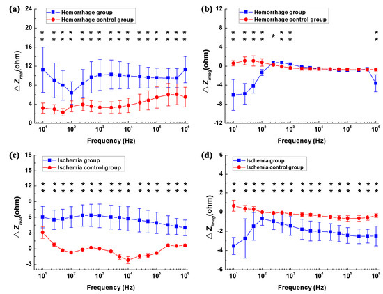 Figure 5a,b shows the differences in real and imaginary parts of brain impedance spectra in the hemorrhagic group (measured before and after blood was injected) and its control (measured 1 min and 33 min after the needle was inserted). As shown in Figure 5a, the difference in the real part before and after blood was injected decreased initially from 10 Hz to 100 Hz and then increased within 100 Hz–1 MHz, varying in the range from 6.4 ohms (smallest value at 100 Hz) to 11.3 ohms (largest value at 1 MHz). In contrast, the difference in the real part was less than six ohms in the hemorrhage control group. Across the whole frequency range, there were significant differences in the real part between the hemorrhage group and its control (p < 0.01). In the hemorrhage group, the difference in the imaginary part increased sharply by 5.3 ohms from 10 Hz to 500 Hz, declined slowly by one ohm within 500 Hz–200 kHz and finally increased dramatically by three ohms between 500 kHz and 1 MHz. In contrast, the difference in the imaginary part was less than two ohms in the hemorrhage control group. Across the 10 Hz–1 kHz and 5 kHz–1 MHz frequency ranges, the difference in the imaginary part differed significantly between the hemorrhage group and its control (p < 0.05). These results indicated that brain impedance spectra changed significantly following hemorrhagic stroke.