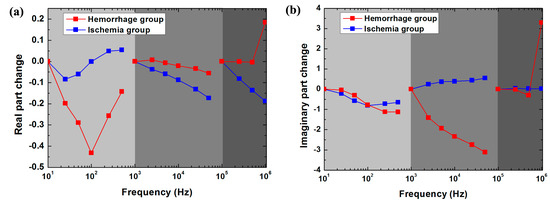 As shown in Figure 6a, within 10 Hz–1 kHz, the change in the real part of brain impedance after hemorrhage decreased by up to approximately 45% from 10 Hz to 100 Hz and then increased rapidly. In contrast, the range of variation remained small (<5%) after ischemia. Between 1 kHz and 100 kHz, the magnitude of the change in the real part after hemorrhage (5%) was greater than that after ischemia (20%). From 100 kHz to 1 MHz, the change in the real part after ischemia decreased with frequency (approximately 5%), whereas the change after hemorrhage was almost zero within 100 kHz–500 kHz but increased significantly by approximately 20%within 500 kHz–1 MHz. Thus, across the whole frequency range, the rate of change in the real part was much different between hemorrhagic and ischemic stroke.