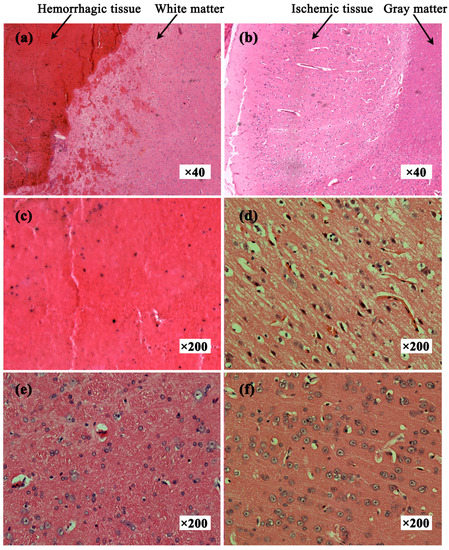 Hematoxylin and eosin-stained tissue sections. (a) Hemorrhagic tissue with surrounding white matter; (b) Ischemic tissue with surrounding gray matter; (c) Hemorrhagic tissue (blood clot); (d) Ischemic tissue; (e) Normal white matter; (f) Normal gray matter.