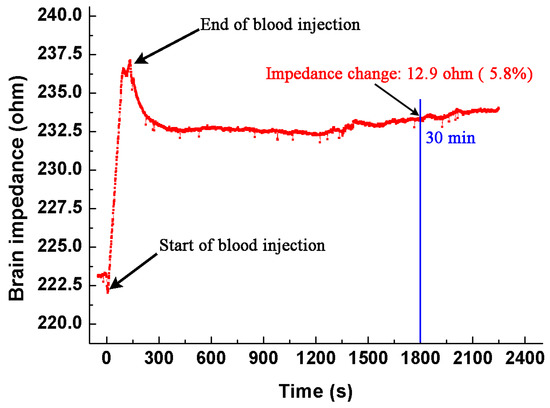 To further validate our results, we carried out an experiment using an animal model. The method to establish the intracranial hemorrhage model was the same as that described in Section 2.3. During the whole procedure of blood injection and 30 min after injection, we monitored the brain impedance using the EIT system developed by our group, which could operate from 1 kHz to 190 kHz, with precision better than 0.05% [30]. The current used was 200 μA at 50 kHz. Figure 8 shows the brain impedance during the entire experiment. In the procedure of blood injection, the brain impedance increased sharply. After the completion of injection, the brain impedance decreased slowly with little change in the end. The change of brain impedance before and 30 min after blood injection is 12.9 Ω, which is approximate to the result (10.5 Ω) we reported.
