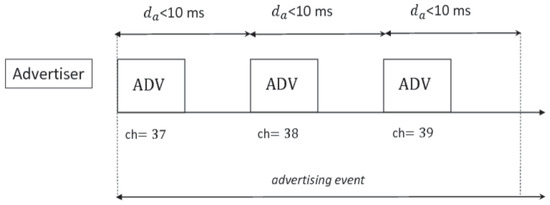 The BLE radio operates in the GHz to GHz frequency Industrial, Scientific and Medical (ISM) band, with Gaussian Frequency-Shift Keying (GFSK) modulation. It splits the spectrum into 40 channels, each 2 MHz wide, and runs Frequency-Hopping Spread Spectrum (FHSS) to avoid interference. Three of these channels are used for advertising, connection-initiating and data-transfer in connectionless communication, while the remaining 37 channels are used for data-transfer in connection-oriented communication. In BLE, each advertising node runs an advertising event once at the beginning of each advertising interval. This can be set per tag in the range of values from 20 ms to 10,240 ms in steps of ms. The BLE protocol does not implement carrier sensing on the used channels, and, because of this, the advertiser sends the same advertising packet to all the dedicated three channels 37 (2402 MHz), 38 (2426 MHz), 39 (2480 MHz) at each advertising event in order to avoid repeated collisions. Figure 1 depicts the advertising event timeline. Moreover, each advertiser adds a random delay up to 10 ms to avoid a massive contention.