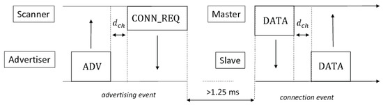 Bluetooth Low Energy (BLE), marketed as Bluetooth Smart, is a subset of legacy Bluetooth (BT), sometimes referred to as classic Bluetooth (BT). It was introduced as a part of the Bluetooth 4.0 core specification [1]. While it inherits many features from the legacy BT, BLE is different in terms of all the functionalities regarding smart energy management. The BT radio is integrated into more than 8.2 billion products, produced by over 30,000 Bluetooth Special Interest Group (SIG) members [2], and this makes the BLE an ideal candidate for the wireless technology for Body Area Networks (BAN) and Internet of Things (IoT) markets, including automotive [3,4,5], smart cities [6], healthcare [7,8,9,10], fitness [11,12], consumer electronics [13], and building and home automation [14,15,16]. The advantages in the use of BLE include: (i) low power functionalities, operating for months or years on a coin-cell, (ii) small size and low cost, (iii) full compatibility with commonly-used devices such as mobile phones, tablets and computers. These properties make the BLE more favorable for many short-range communication applications. The classic Bluetooth has 79 channels, 1 MHz spaced, while the BLE splits the GHz spectrum into 40 channels, each 2 MHz wide. Of these, 37 channels are used for data transmission, while the remaining 3 are used for connectionless communication, such as device discovery. In particular, the neighbour discovery has been designed according to a concise state-machine, aimed to simplify the operations and to minimize the power consumption. However, connectionless communication is also designed for generic broadcasting tasks, for example the transmission of state data, i.e., small and infrequent bits of data. This network architecture shall be referred to as the connectionless data model. It foresees the advertising devices, also called tags, which exchange tiny data with a scanning central device without synchronization, but at a reduced latency. It is the case for event-driven sensors, that need to send data only after event detection. Generally, these kinds of sensors are strongly energy-constrained and, for this reason, designed to keep the radio turned off for as long as possible. The BLE protocol recommends several parameter settings for connectionless and connection-oriented communications, and their proper tuning to balance and optimize the performance for a wide range of applications in terms of latency, energy consumption and throughput. Some application scenarios require that unconnected sensors that monitor relatively unpredictable and rare events, could operate in coexistence with sensors that are always connected, continuously communicating health or environmental data. The coexistence of connection-oriented and connectionless networks, sharing a single central/collector node can be required to reduce the number of handling devices, keeping the network complexity low and limiting the packet’s traffic congestion. The central device must be programmed in order to better schedule scanning and connection duty cycles, thus optimizing the use of the time division multiple access (TDMA) scheme. To the best of our knowledge, this is the first work that proposes a tool supporting the design and the configuration of BLE devices, allowing a single central node to manage either sensors working in connectionless mode, as advertisers, and other sensors, acting as slave nodes, in persistent connection. Models for both the connectionless and connection-oriented communications have been merged to obtain an algorithm that is able to estimate the discovery latency for event-driven sensors in relation to the loss of connected sensors data, caused by a bad central scheduling of communication operations. The paper is organized as follows: related works are presented in Section 2. An overview of BLE is provided in Section 3. In Section 4, first, a statistical-iterative model for discovery latency estimation is presented and, second, the tools to balance the performances of connectionless and connection-oriented devices, sharing a single central node, are provided. Section 5 presents the results obtained by the application of developed methods and provides an analysis of them. Finally, conclusions are given in Section 6.