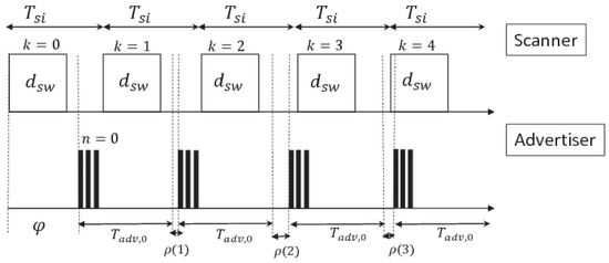 - , i.e., the offset between the first scan event and the first advertising event anchor points, is modeled through the uniform distribution with boundaries 0 and ,