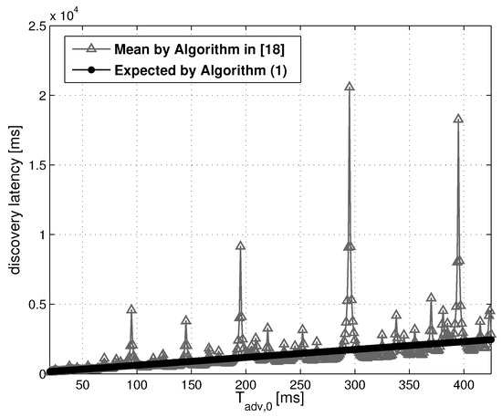 As visible in Figure 5, the amplitude of periodically becomes very high, giving rise to noticeable peaks for close to multiples of and . It is important to clarify that the algorithm in [18] estimates the discovery latency averaging the delays obtained by varying the offset from 0 to . For close to multiples of or , the discovery latency drastically increases, but only for a few values of . The average is strongly affected by these few but high values. Algorithm 1 generalizes the description of the discovery latency, not using any kind of average, but directly inserting in the probabilistic model. As a result, the solid line shows a linear relationship between and estimated by Algorithm 1. This result produces a manageable representation of trend that is easier to integrate in more complex models.