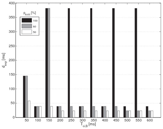 When two devices request to establish a connection link to a central node, the latter must assign proper connection intervals to them and space their anchor points in order to manage the data exchanges without overlaps. In fact, assuming the master was previously connected to the slave A with connection interval , it must properly design the configuration for B for the incoming connection. The choice is constrained by the presence of one already active connection, and must fit the condition Equation (8). If the central node also has to listen to advertising devices, it must properly set the connection interval of the second device B and fit the condition Equation (10) in order to better schedule both the slaves and tags. Fixing and , Algorithm 2 gives back the values of that reach the right balance between a limited and a high percentage of successful connection events. The histogram in Equation (6) depicts the results produced from Algorithm 2, fixing and equal to the typically used value 100 ms and varying in the interval ms with steps of 50 ms. It shows and on the x- and y- axis, respectively. There are three bars per each couple of values : black for , grey for , white for . Some observations can be derived: