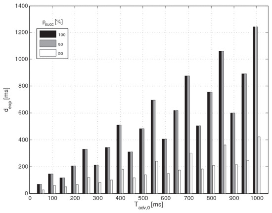 Algorithm 2 can also be used by fixing and and varying . For example, assigning to the parameters and the values 100 ms and 50 ms respectively, the algorithm gives back the discovery latencies related to ascending values of in the range ms, for given percentages of . For these settings the scan parameters are easily evaluated: ms, ms for and ms for . The histogram in Figure 7 shows the advertising interval on the x-axis and the discovery latency on the y-axis. There are three bars per each couple of values : black for , grey for , white for . As it can be seen, for fixed value of scan interval and scan window the discovery latency linearly rises by increasing the advertising interval, according to the results discussed in the previous paragraph. This implies that tags which transmit very frequently are able to minimize the discovery latency, particularly when the scan window is tiny compared to the scan interval, i.e., for a low receiver duty cycle.
