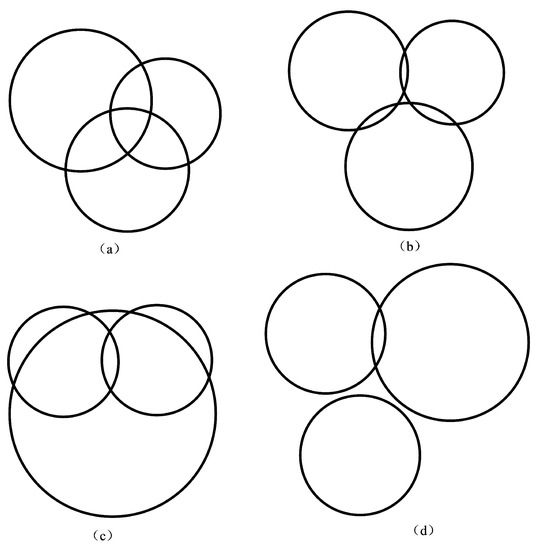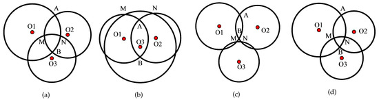 As is shown from the figure, Figure 1a–c refer to the two intersections of anchor circles, where the intersection determination criterion is necessary to determine the “best” intersection. In addition, Figure 1d refers to no intersection points, where the distance compensation can be applied to alleviate the problem.