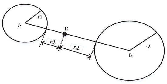 The distance compensation methods are often applied to solve the non existence problem of the intersection points. It compensates for the distance by extending the radius of the anchor circle when detecting no intersection points of the anchor circles. Reference [31] proposed a weighted trilateration method to obtain the point of the intersection based on the AWGN channel. It calculates the expanded distance as the weighted distance along the line crossing the centers whose weight is computed as the ratio of the radii of circles, as is shown in Figure 3.