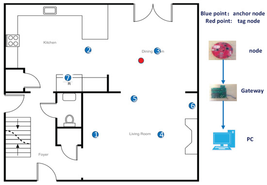 In the experiments, there are seven anchor nodes and one tag node (target) initially placed in a 25 m × 25 m square room, as shown in Figure 4. The hardware platforms of the anchor nodes, the tag node and gateway to the upper computer are shown on the right side of the figure. The DecaWave DWM1000 module, Dublin, Ireland is selected as the UWB ranging device that is installed on all the anchor nodes and the tag node. The TI SmartRF CC2538EM module, Dallas, TX, USA is selected as the communication device between all of the devices. Since the two-way ranging does not require accurate time synchronization, the time of flight method is applied to calculate the range by measuring elapsed time for a transmission between a tag and an anchor node based on the estimated propagation speed of an UWB signal through a medium.