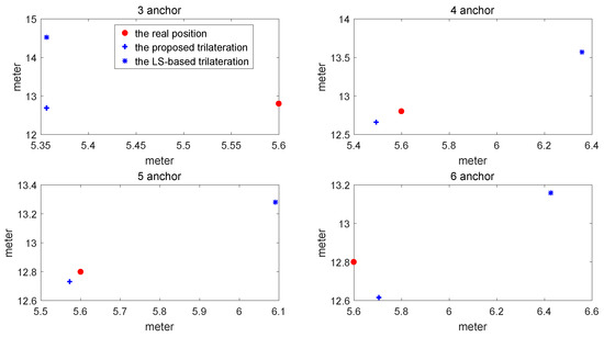 The comparison of location estimate between the proposed method and LS-based trilateration method is shown in Figure 5. The comparison of RMSE varying with the number of sensors between the proposed method and the conventional LS-based trilateration method is shown in Figure 6 and Table 1.