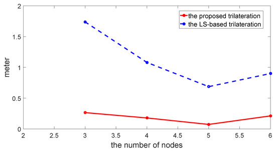 Comparison of RMSE varying with numbers of sensors between the proposed method and the LS-based trilateration method.