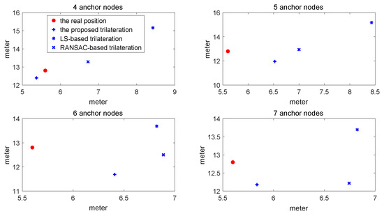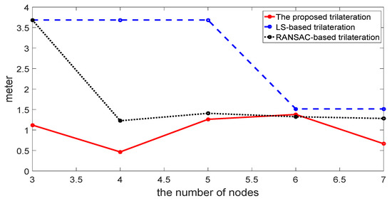As is indicated from the above figures and the table, the RMSE of the proposed method is lower than that of the LS-based trilateration method and RANSAC-based trilateration method. Furthermore, when the seventh anchor node is added to compute the location, the RMSE of the proposed method is reduced whilst that of other methods are not, which shows that its distance is influenced by NLOS and the multipath fading channel is well compensated. Therefore, the proposed trilateration method is efficient in terms of robustness to outliers.