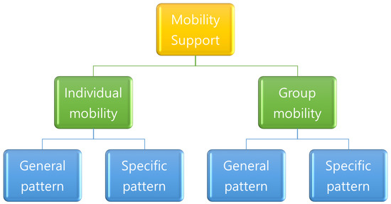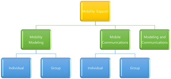 There may be several ways to categorize the existing schemes for mobility support in WBANs. Among the possible ways of grouping, we focus on two principles: what is the research objective and how many nodes move in the same group. Currently, there are two major research topics to support mobility in WBAN. One is analytic (mathematical) modeling of mobility patterns and the other is networking technology to support mobility. The former is to extract relationships between moving nodes and then make them regular patterns. On the other hand, the latter is to define communication protocol and network architecture to handle topology change caused by human behavior.