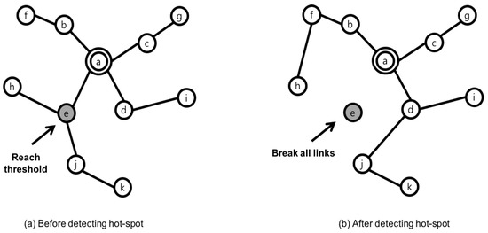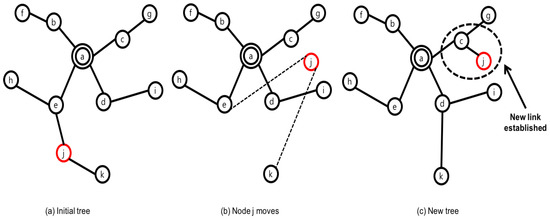 As far as the authors are aware, the Mobility-supporting Adaptive Threshold-based Thermal-aware Energy-efficient Multi-hop ProTocol (M-ATTEMPT) [24] is the most applicable protocol for mobility in WBANs. It is a temperature aware protocol under tree structure. Whenever a person changes his/her gesture, the tree is rebuilt by a node’s joining to the new parent node. In M-ATTEMPT, a sink node locates at the center of body and the nearest node from a sink node is set to the parent node, which is root of the tree. When a node changes location, a larger amount of energy will be consumed if the current tree path is maintained. To prevent this unsuitable waste, a node connects to the new parent node after disconnecting from the link. Through these procedures, a new tree is constructed and a data packet is delivered along the links on the tree. Furthermore, M-ATTEMPT provides two major functions to handle hot spot and mobility at the same time as adjusting the tree. Figure 3 shows the procedure to prevent the hot spot. In this example, node e reaches the temperature threshold due to the forwarding task. Whenever each node becomes the hot spot, the parent node disconnects all links from child nodes during the next few rounds. When a node’s temperature status turns normal, a link is reestablished. If a hot spot parent node receives a data packet from the child, it returns the data packet to the child. If this case happens, the child node marks its parent as a hot spot in order to not deliver the packet next time. The mobility function provided by M-ATTEMPT is illustrated in Figure 4. If a child node moves to another place, it disconnects the link to the parent node in order to reduce the communication overhead. Upon being disconnected, a node searches the nearest parent node and rebuilds the tree dynamically by sending a joint-request message. These sequential procedures are explained in order of from Figure 4a–c.