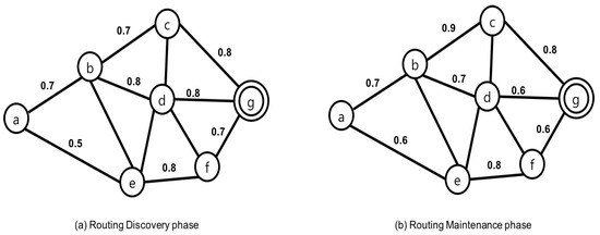 First, Reliable Multi-Path Routing (RMPR) [35] belongs to reactive protocols. Its operation consists of three major phases: route discovery, route maintenance and data delivery. At the route discovery phase, a sensor node floods the Route Request (RREQ) packet to all neighbors. Intermediate node information and a new metric, String Factor (SF), are added to the packet accordingly. After receiving this RREQ message, a sink node replies with a Route Reply (RREP) packet to establish multiple paths. A source node decides the routing path with the highest SF value for the path. Once the path is established, if link quality on the routing path becomes worse, a path is replaced by one with the highest sum of SF in the route maintenance phase. In this case, multiple paths are used to transmit reply messages. Figure 5 shows the operations of RMPR. In this example, SF is set to a ratio of the received power level between two nodes where node a is source and g is sink. After RREQ and RREP packets are exchanged, three separate paths are distinguished according to SF value: (i) a − b − c − g = 0.39; (ii) a − b − d − g = 0.44; and (iii) a − e − f − g = 0.28. These values are computed by multiplying SF values of all intermediate nodes along the path. Among them, path (ii) is selected because it has the highest SF value. When SF value varies due to node movement as shown in Figure 5b. SF value on each path is updated as (i) a − b − c − g = 0.5, (ii) a − b − d − g = 0.29, (iii) a − e − f − g = 0.28, respectively. According to the path selection rule, path (i) is selected for packet delivery.