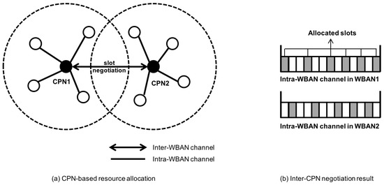 The Random Contention-based Resource Allocation (RACOON) [44] is a bandwidth control system to support multi Quality of Service (QoS) in MAC layers. It has two important components: Central Processing Node (CPN)-based resource allocation and random contention-based inter-CPN negotiation. Unlike typical WSN, CPN-based protocol has two separate channels. Inter-WBAN channel is used to exchange resource negotiation message while Intra-WBAN channel is for polling and data packets. CPN sends a polling message to each sensor node according to the polling slot. When the coverage of two nodes is duplicated, CPN resource negotiation is performed in the Inter-WBAN channel. In this protocol, different priority and bandwidth are given to each WBAN. Figure 6 illustrates an example of resource allocation in RACOON. In Figure 6a, if two WBANs have duplicate coverage areas, inter-WBAN channel is used to perform CPN resource negotiation. After negotiation, a superframe slot for the Intra-WBAN channel is used for data communications as shown in Figure 6b. As an approach in the MAC layer, Time-Synchronized Channel Hopping (TSCH) can be applied in WBAN to provide collision-free and interference-avoiding communications. In order to reach a steady state in early time without mobility, decentralized time- synchronized channel swapping (DT-SCS) was proposed in [45] to achieve high bandwidth utilization, and connectivity was also achieved.