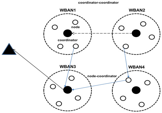 Figure 7 illustrates the scenario for cooperation among four WBANs. When the battery of coordinator nodes in both WBAN1 and WBAN4 is almost drained out, a sensor node in WBAN1 transmits packets to new coordinators in WBAN3 while a node in WBAN2 sends packets to the nearest node in WBAN4 through node–node communications. Consequently, a receiving sensor node in WBAN4 sends packets to coordinators in WBAN3 instead of one in WBAN4, which suffers from low battery power.