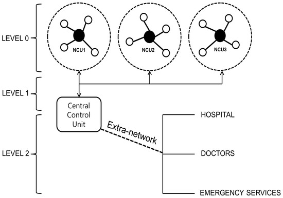 Second, two outstanding protocols were presented: Distance-Aware Relaying Energy-efficient (DARE) and Mutual Information based (MI-DARE) [52] for eight patients in the hospital. In DARE, each patient possesses multiple data monitoring sensors, event-driven data monitoring sensors and one Body Relay node (BR), whereas one sink node locates at the center in a hospital room. Both sensor and BR check their alive status. If the measured value is lower than threshold, a sensor node measures the distance between them. Based on this distance, it computes energy consumption cost and transmission delay. Upon completing computations on all sensor nodes, BR aggregates all information and then sends it to the sink. An extended MI-DARE focuses on continuous data monitoring sensor. Especially, in order to prevent multiple transmissions, the value is transmitted only if the difference between two consecutive values are beyond the threshold. In addition to two papers above, Rathee et al. [53] introduced an architecture to combine WBAN MAC protocol and Cognitive Radio Technology without aiming at any specific environments. The proposed architecture consists of three levels. At Level 0, sensor nodes and actuators are embedded into patients. Each sensor node and actuator has different designs in cognitive approach. In addition, Cognitive Radio Technology (CRT) based Network Coordination Units (NCUs) play a role in sink nodes on the body. The functions include data fusion, spectrum sensing, configurable networking, energy efficiency and reliable data routing, in addition to wireless cognitive connectivity with Central Controlling Units (CCUs). Next, Inter-WBAN communications at Level 1 are accomplished by more than two NCUs thats are connected to CCUs. The CCUs are responsible for spectrum sensing, energy efficiency and highly reliable routing and QoS awareness. Finally, CCUs make wireless connections to external hospitals and doctors in Level 2. The architecture is illustrated in Figure 8, where NCUs and CCUs are additionally embedded into existing modules to support CRT.
