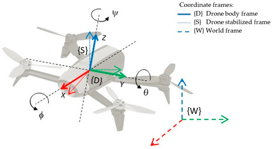 Coordinate frames {D}, {S} and {W}: drone frame {D} is attached to the drone’s body; stabilized frame {S} is parallel to the floor; world frame {W} matches the initial position of the drone.