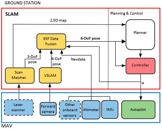 As stated above, the developed system is distributed between the flying unit (MAV) and a remote ground station, as it is shown in Figure 3. The flying unit is treated as a black box, and includes at least one onboard controller/processor that executes an autopilot and performs the reading and sending of onboard sensors measurements. When a laser sensor is present, as in the Erle-Copter, it is connected to the onboard processor that needs to be able to read and send these measurements through the network created by the drone. The SLAM module is executed in the ground station, as well as the control and planning modules, the last one being out of the scope of this paper. The use of ROS as development framework facilitates the setting of this distributed system.