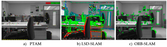 Image processing using some of the most significant monocular VSLAM methods: (a) PTAM; (b) LSD-SLAM and (c) ORB-SLAM.