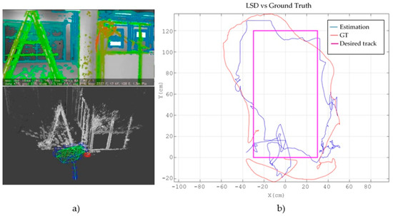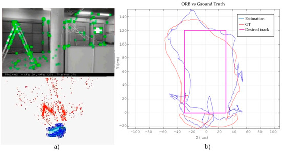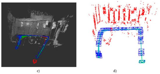 Figure 5d and Figure 6d show the initial results obtained with ORB-SLAM with scale correction in the same test environments. They show in red colour the ORB-features map and in green colour the estimated trajectory. As a featured-based method, the greatest weakness of ORB-SLAM lies again in poorly featured areas as corridors. In this case, corridors are also shortened about a 35%, from 22 to 14 m the first one, and from 16 to 10 m the second one. However, this method is more accurate than LSD-SLAM in well-lit rooms and in the storage room scenario. In the latter case, the second segment is also lengthened due to poor illumination, but in this case only from 4 to 4.4 m. Besides, ORB-SLAM is more precise than LSD-SLAM in pure rotational movements.