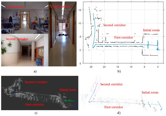 Initial results of state-of-the-art SLAM algorithms in a corridor area (a poorly featured environment). (a) View of the test environment; (b) “Hector-mapping” results: black points represent the 2D map and the blue line shows the estimated trajectory ; (c) “LSD-SLAM” results with scale correction: grey points conform the semi-dense map, the green line represents the estimated trajectory and the blue marks are the camera’s poses where a new keyframe was captured; (d) “ORB-SLAM” results with scale correction: the sparse map of ORB-features is coloured in red, the green line represents the estimated trajectory and the blue marks are the camera’s poses where a new keyframe was captured.