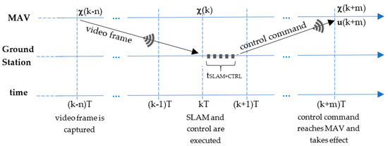 For controlling a quickly reacting system such as a MAV, an accurate and delay-free state estimation is required. The delays in the estimation lead to a poor control even if the estimation is correct. When using a low-cost MAV, the delay caused by the wireless communication channel must be taken into account, mainly in the transmission of the compressed camera images. The time required between the instant a frame is captured and the instant the respective calculated control signal is applied (i.e., the time required for encoding the image on the drone, transmitting it via wireless LAN, decoding it on the PC, applying visual SLAM, data fusion and control calculations and transmitting the resulting control signal back to the drone) lies between 160 ms and 300 ms. Fortunately, these delays can be easily compensated within the EKF framework.
