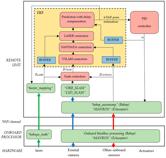 One of the main specifications of the proposed SLAM system is that it can be configured to be implemented with different low-cost MAVs, using their onboard sensors. Usually, the software running onboard a commercial MAV is not accessible, and the control software is neither open-source nor documented in any way. Indeed, many low-cost MAVs are primarily sold as high-tech toys and only can be commanded from their own applications running on a Smartphone or a laptop. However, other platforms provide a Software Development Kit (SDK) for programming applications by sending commands through an ad-hoc wireless LAN network set up by the drone, opening the door to research works. Some of these MAVs, whose drivers are available as ROS packages to be easily used, are the Pelican and Hummingbird quadrotors of Ascending Technologies [35], the CrazyFlie of Bitcraze [36], the Matrice 100 of DJI [37], the Erle-copter of Erle Robotics [38], or the AR-Drone and Bebop drones of Parrot [39].