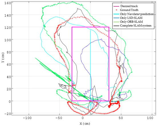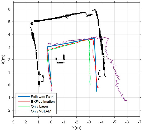 Firstly, the results obtained in the storage room test environment are shown in Figure 13. The blue line represents the metrics of the actual path followed by the drone. Three different estimations are shown in the same figure. The magenta trajectory corresponds to the estimation of the VSLAM module using ORB-SLAM. As previously noted, the poor lighting in this area yields to a wrong estimation of the length of the second and third segments of the path. The green trajectory shows the estimation performed by the scan matcher module. As it is a confined space with easy features as corners, this estimation is better than the visual one, but, even so, a shortening effect is observed. Finally, the red trajectory shows the estimation obtained as output of the EKF with our complete SLAM system. In this case, laser and visual estimations are fused with the measurements of IMU and altimeter, and combined with the prediction stage of the EKF. This results in a much more accurate pose estimation, as it is shown in Table 5, that displays the translational errors of the three estimations.