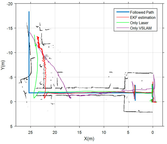 Finally, we show in Figure 14 the results obtained in the corridors test environment. In this case, the followed path starts in a well-lit room, and continues along two L-shaped corridors in which nearly all doors were closed, hindering laser features detection. Again, blue line is the actual followed path, magenta and green lines are the estimations of the VSLAM module and scan matcher module respectively. The red path is the estimation of our complete SLAM system. The three estimations provide good results in the initial room, because it is a well-lit confined area. However, it is observed that both laser and vision produce a shortening effect in the estimation of the length of the corridors. This effect is also reflected in the laser map that is constructed by the scan matcher module using only laser measurements. Although the estimation of the laser module is much more accurate, it cannot compensate the harmful effect of VSLAM in the corridor. So, translational errors become quite large in this environment, as can be verified in Table 6. Anyway, the scan matcher module allows a clear improvement in the results of the estimation. This experiment proves that pose estimation along corridors continue to be a challenge in indoor navigation of aerial robots that do not dispose of classical odometric systems based on direct contact with the environment.