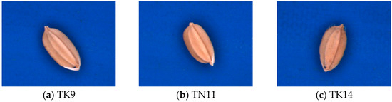 The rice grains examined in previous studies [1,2,3,4] have different appearances and are more distinguishable than the Taikong 9 (TK9), Tainan 11 (TN11), and Taikong 14 (TK14) seeds, which were the focus of the present study. TK9, TN11, and TK14 are so similar on appearance that they are difficult to identify (Figure 1). Therefore, the purpose of this study was to establish an algorithm for recognizing these three paddy seeds. Specifically, the geometric features of the seeds were to be extracted and then used to differentiate between the three paddy seed varieties (TK9, TN11, and TK14).